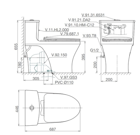 Bàn cầu một khối HL2 có kích thước nhỏ gọn chỉ L687 * W446 * H655, phù hợp cho mọi diện tích và yêu cầu sử dụng.